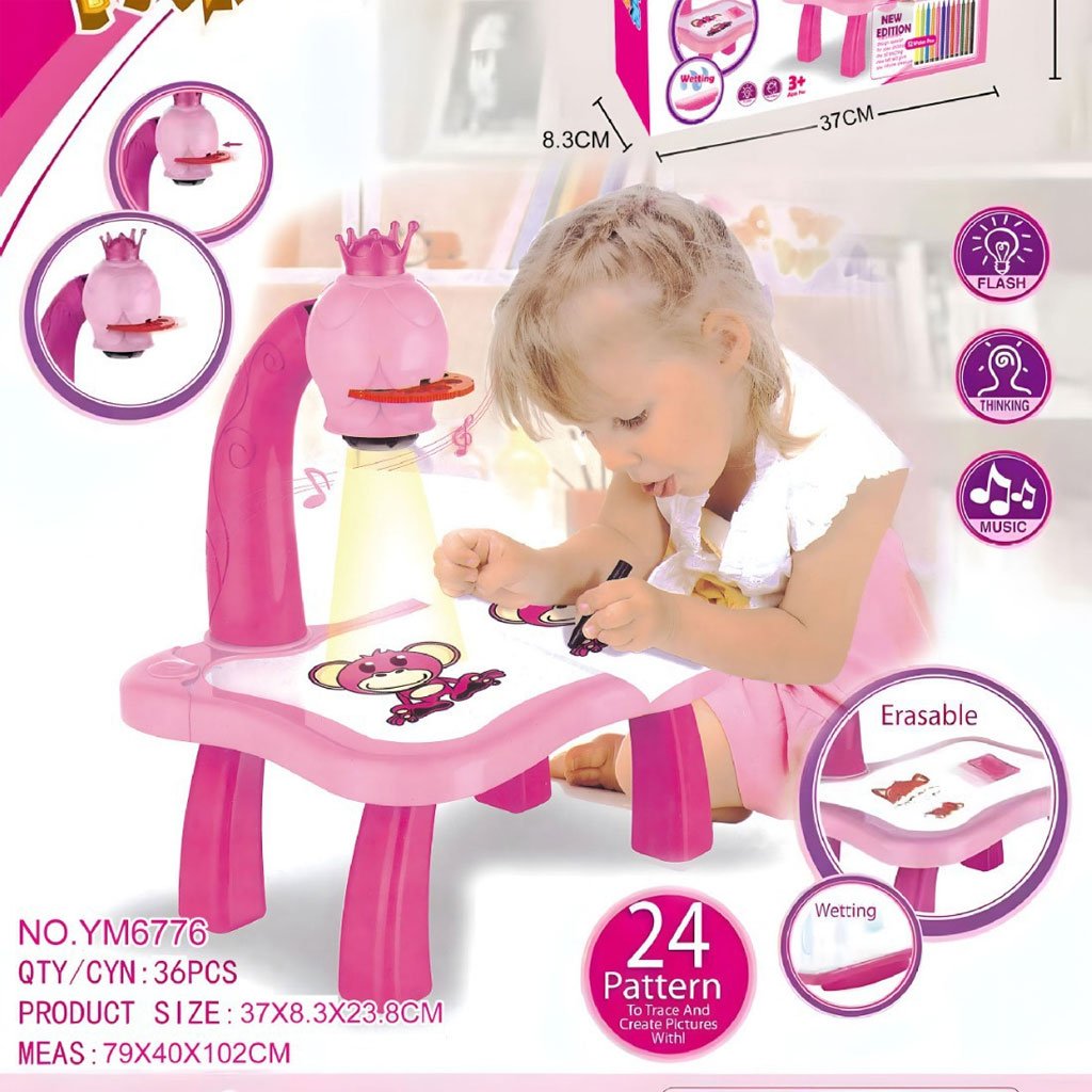 Description du produit Un projecteur fantastique en forme de girafe mignonne qui encouragera sans aucun doute tous les enfants à peindre et à dessiner. Des couleurs vives et chaudes attireront l’attention d’un enfant qui passera beaucoup de temps à peindre ! Comment fonctionne ce speelgoed? Il vous suffit de mettre 3 piles AA, de choisir l’une des six superpositions et de la placer dans la gueule de l’animal. Allumez ensuite le projecteur avec l’interrupteur sur la tête de la girafe et vous pouvez commencer à dessiner ! Les images peuvent être créées directement sur la table du projecteur et essuyées avec l’éponge incluse lorsque vous avez fini de jouer. Cette tactique signifie que vous n’avez pas besoin de beaucoup de cartes ou de livres de coloriage. Ce sera une solution beaucoup moins chère et réutilisable. Mais si vous voulez montrer les belles images de votre photo à l’intérieur de votre maison, vous pouvez mettre une feuille vierge sur le comptoir. L’image affichée sera aussi visible que sur un dessus de table vide. Le dessin fini peut être accroché au koelkast ou encadré – pour que tout le monde puisse l’admirer ! L’ensemble contient 12 stylos de couleur avec lesquels vous pouvez facilement créer tous les motifs inclus ! Jusqu’à 6 superpositions attachées contiennent un total de 36 images différentes. Si vous les fabriquez tous, votre enfant s’amusera beaucoup ! Le dessin a un grand effet sur la dextérité manuelle de l’enfant – il améliore la précision de la main et celle des doigts. Plus tôt il commencera à peindre, plus il lui sera facile plus tard de maîtriser des compétences telles que l’écriture. La Créativité et l’imagination ne sont pas en reste – créer des images différentes, nouvelles et plus complexes permettra à tout enfant de s’épanouir ! En jouant avec le projecteur, vous apprenez également à distinguer les couleurs, à créer et à reconnaître de nouvelles formes. Ce sera formidable comme cadeau – cela apportera non seulement un immense plaisir, mais aussi un bon développement de l’enfant. Cela pourrait être le début de la grande passion de votre enfant ! Contenu du Kit : Une table avec un projecteur 6 superpositions avec 6 images à redessiner Éponge abrasive Carnet de dessin pour photos Set de 12 marqueurs Matière : plastique Âge de l’enfant : 3+ Alimentation : 3 piles AA (non incluses) Dimensions : Tableau : 25cm x 21cm x 35cm Hauteur du plateau de table depuis le sol : 13 cm Dimensions plateau : 25cm x 21cm La hauteur du projecteur à partir du dessus de table : 16,5 cm Emballage : 26 cm x 22,5 cm x 8 cm