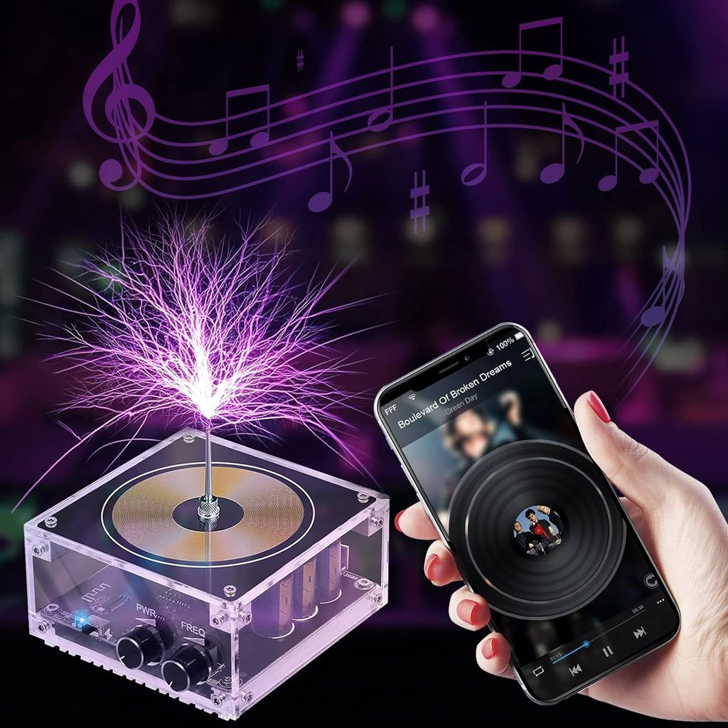 ◆ 【Amusement sans fin】 Il génère un courant alternatif à haute fréquence grâce à l’oscillation de la puce et au contrôle audio, peut émettre un bel arc de plus de 10 cm, l’arc pousse l’air pour générer du son, montrant un effet de foudre parfait. À puissance moyenne, lorsque vous le touchez avec votre main, la foudre battante, c’est comme masser votre main, découvrez le charme de la foudre dans la paume de votre main, ce qui améliore la capacité d’apprentissage et d’exploration. ◆ 【Œuvre d’art multifonctionnelle】 Elle peut être utilisée comme une expérience physique, ainsi que pour allumer le tuyau d’air et diverses bulles. Elle peut être placée horizontalement ou verticalement. Lorsqu’elle allume une lampe au néon, une lampe ultraviolette, une lampe lumineuse ou une capture thermique Papier (L’ensemble Bluetooth Music Tesla comprend 10 papiers thermiques, 6 lampes néon, 1 lampe ultraviolette, 1 lampe fluorescente), il fonctionne à merveille. ◆ 【Connexion Bluetooth】 Passez à l’équipement musical, scannez le code QR pour obtenir de la musique à ondes carrées (mise à jour en permanence), connectez-vous à la bobine Tesla via Bluetooth mobile, augmentez lentement la puissance et la fréquence, vous pouvez voir que l’arc de la bobine Tesla bat avec la musique. Différents tons produisent un arc différent. ◆ 【Facile à utiliser】 Avant la mise sous tension, serrez l’aiguille de décharge, passez à la vitesse d’arrêt de la musique, tournez les boutons de fréquence et d’alimentation dans le sens inverse des aiguilles d’une montre jusqu’à la fin, branchez l’alimentation, augmentez lentement la puissance et la fréquence, vous pouvez voir l’éclair devant vos yeux, contrôlez l’arc de l’éclair pour qu’il devienne progressivement plus grand et plus épais. ◆【Remarque】1. Lorsque la bobine Tesla est en mode musique, ne l’allumez pas pendant une longue période sans écouter de la musique. 2. Ne placez pas de gros objets sur l’aiguille de décharge pour éviter l’échec du déclenchement de l’arc. 3. Ne placez pas de LED sur la surface de la bobine Tesla pour éviter d’endommager le boîtier en acrylique de la bobine Tesla. 4. Les matériaux inflammables et explosifs doivent être tenus à l’écart.