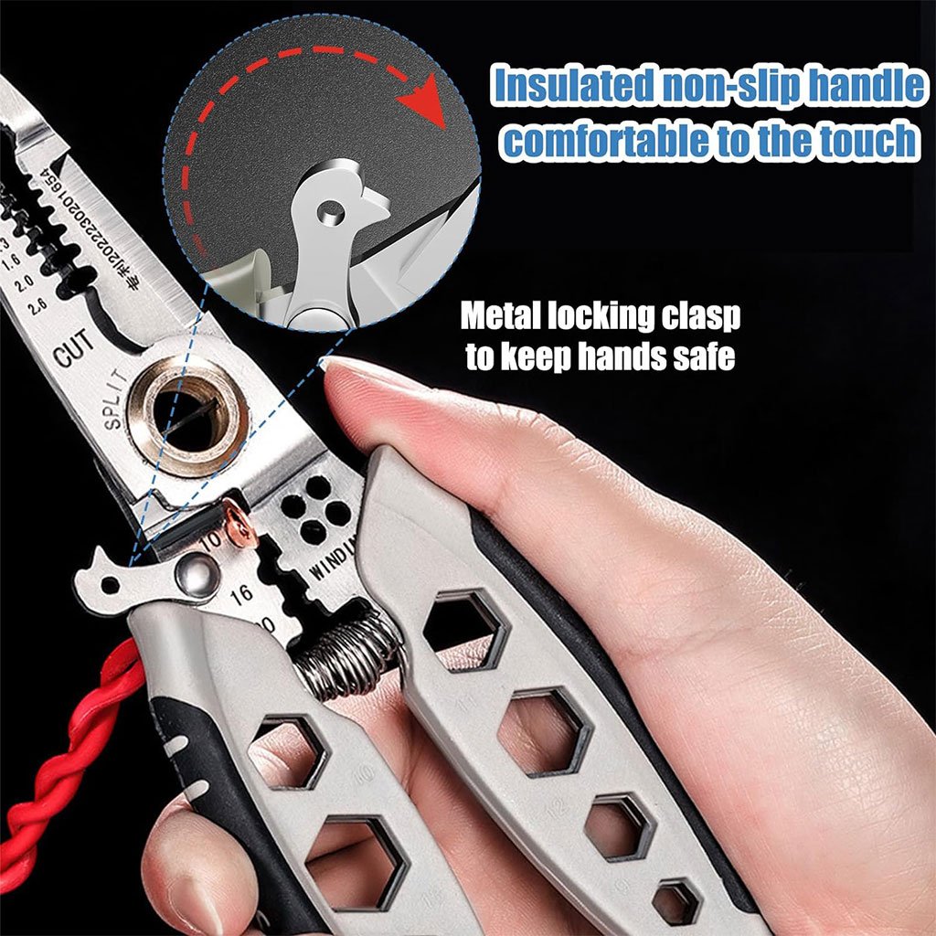 Améliorer l’efficacité: Une pince à dénuder pratique multifonction pour une large gamme de travaux électriques tels que dénuder, couper, sertir, enrouler, desserrer, tordre et serrer des fils. Il n’est pas nécessaire de changer fréquemment de pince lors de l’utilisation, ce qui améliore l’efficacité du travail. Pince a denuder electricien de haute qualité】Forgée en acier au chrome vanadium, dure, antirouille, résistante à l’usure et durable. Les trous de vis sur la poignée permettent d’utiliser facilement des vis et des écrous de 6 mm à 13 mm. Coupe lisse et sans bavure: Les lames pointues de la nouvelle pince à dénuder peuvent couper les cosses rapidement et facilement. Le dénudage est facile et rapide sans endommager l’âme du fil. La vitesse de coupe est rapide et la coupe est lisse et sans bavure. Poignées confortables et antidérapantes: Outil à Dénudage Pour Électriciens Professionnel Le design ergonomique, recouvert de caoutchouc et antidérapant de la pince garantit une bonne prise en main. Cela permet une prise en main ferme et évite la fatigue de la main. Répondre à une variété de besoins quotidiens: Ces Outil à dénuder professionnels peuvent répondre à une variété de besoins dans la vie quotidienne ou au travail. Tels que la décoration de la maison, la construction des travailleurs, la réparation du moteur, la réparation des problèmes de câblage, l’artisanat de bricolage et ainsi de suite. Cette pince à dénuder professionnelle est le cadeau idéal pour les maris, les pères, les électriciens et les bricoleurs.