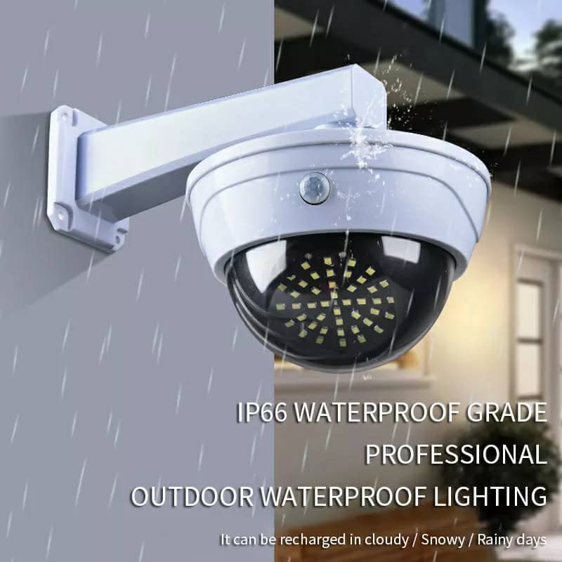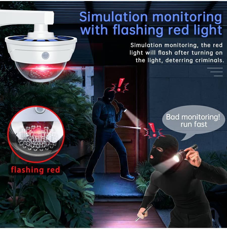 • حل أمني بتكلفة منخفضة: مصنوع من مادة ABS عالية الجودة ويشبه كاميرا حقيقية، مزود بحساس استشعار بالأشعة تحت الحمراء، يعمل كإضاءة عند العودة للمنزل ليلاً مع تأثير ردع للصوص والتخريب دون تكلفة الكاميرات الحقيقية.