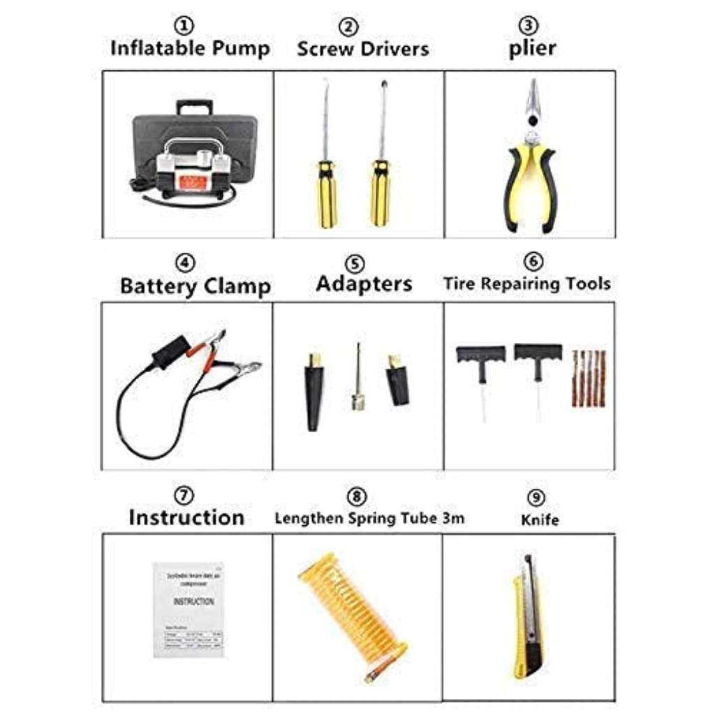 Double Cylindre Haute Performance : Assure un gonflage rapide et puissant, idéal pour les pneus de voiture, moto, SUV et plus encore. Manomètre Analogique Précis : Permet un contrôle exact de la pression jusqu’à 150 PSI pour un gonflage sécurisé. Alimentation 12V : Fonctionne avec l’allume-cigare du véhicule pour une utilisation pratique lors de vos déplacements. Kit de Réparation Inclus : Comprend des outils essentiels pour réparer rapidement les crevaisons sur la route. Construction Robuste : Conçu avec des matériaux durables pour résister à une utilisation intensive.