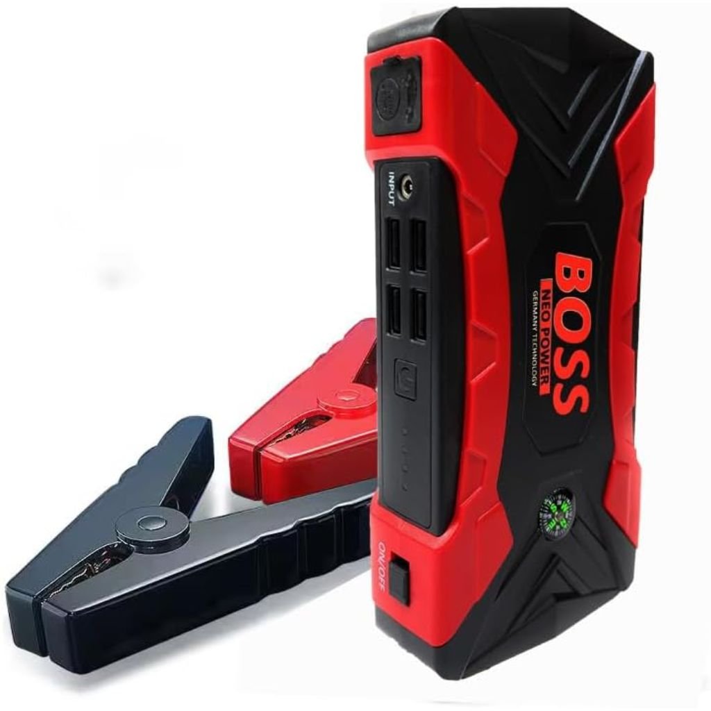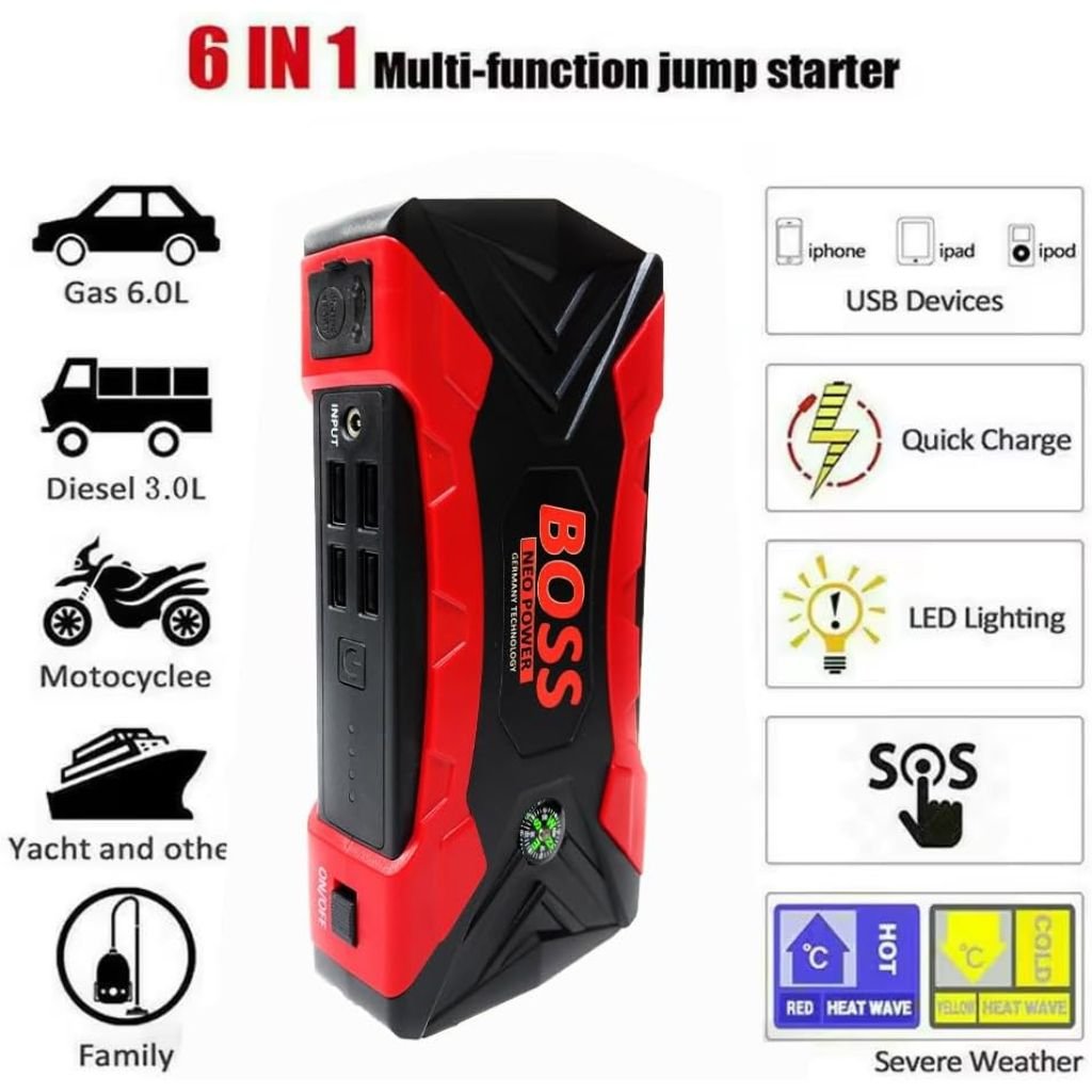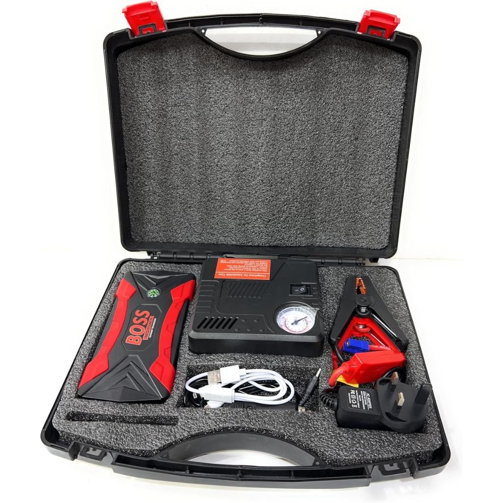 Capacité Élevée de la Batterie : Doté d’une capacité impressionnante de 99800mAh, ce démarreur fournit une puissance fiable pour redémarrer votre véhicule en cas de batterie déchargée. Courant de Démarrage Puissant : Avec un courant de démarrage de 500A et un courant de pointe atteignant 1000A, il est capable de démarrer efficacement une variété de véhicules. Compresseur d’Air Intégré : Équipé d’un compresseur d’air DC, idéal pour gonfler les pneus de votre voiture, vélo ou autres équipements nécessitant une pression d’air adéquate. Ports de Charge Polyvalents : Comprend des sorties USB 5V–2.0A pour recharger vos appareils mobiles, assurant que vos gadgets restent alimentés lors de vos déplacements. Accessoires Complets : Livré avec des câbles de charge mobiles et des adaptateurs AC/DC, offrant une solution tout-en-un pour vos besoins énergétiques en voyage. Sécurité Avancée : Intègre des protections contre les surtensions, les courts-circuits et les surcharges, garantissant une utilisation sécurisée pour vous et vos appareils. Ce démarreur multifonction est un compagnon essentiel pour les conducteurs, offrant une tranquillité d’esprit lors de longs trajets ou en cas d’urgence.