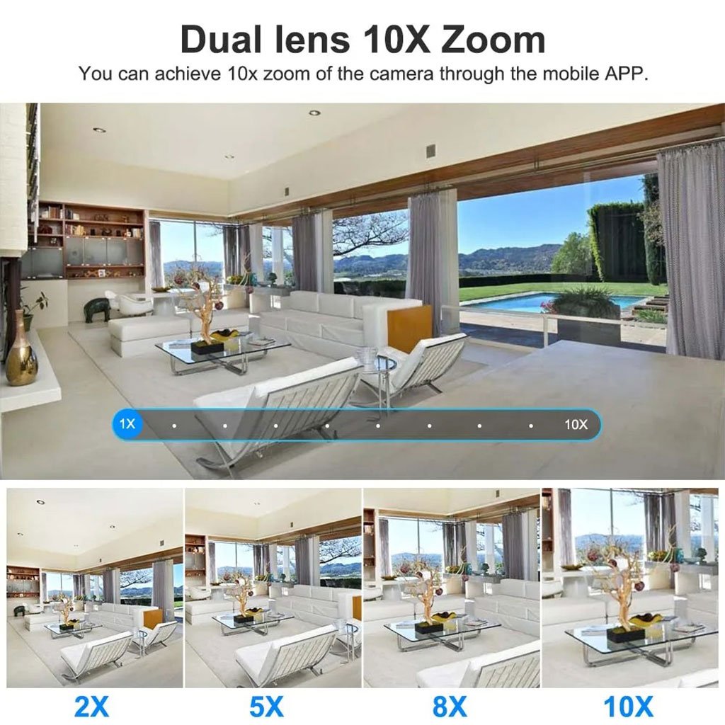 Version 2K HD * Caméra 2K, signifie que les deux objectifs sont chacun en 1080P Caméra à ampoule à double objectif à zoom optique 10X*Caméra de sécurité à double objectif*Caméra à ampoule à zoom optique 10X Suivi automatique humanoïde* Lorsque quelqu’un bouge, la caméra suivra automatiquement les objets en mouvement et enregistrera une vidéo, en attendant une notification. Détection humanoïde AI*Lorsque la caméra de sécurité détecte le mouvement humanoïde, la caméra transmet immédiatement le message d’alarme à l’application. Cette caméra de protection de sécurité peut voir clairement plus de détails de zoom avec une image UHD, vous offrant une meilleure expérience visuelle inégalée par d’autres produits sur le marché. Réalisez que vous voyez de plus grands détails sur des objets distants sans vous en approcher.