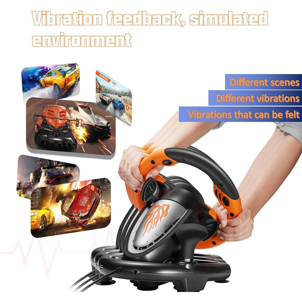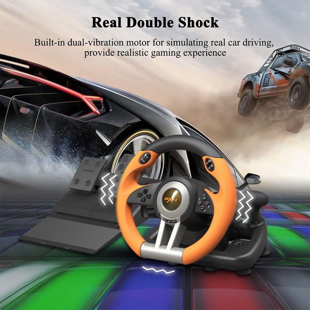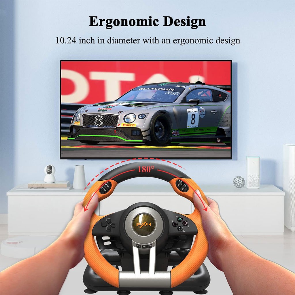 VOLANT FORTEMENT COMPATIBLE : Le volant PXN V3 peut fonctionner sur PC, PS3, PS4, Xbox One, Xbox Series X/S, Switch, et les systèmes Windows 7/8/10/11. Un volant de jeu pour plusieurs plateformes, 6 EN 1 pour jouer à presque tous les jeux de course. Profitez-en ! S’AMUSER SUR PLUSIEURS JEUX : le volant et les pédales de jeu PXN V3 peuvent être utilisés avec de nombreux jeux de course et de simulation de conduite, tels que Forza Horizon, Need for Speed, City Car Driving, Mario Kart, DiRT Rally, F1 2021, European Truck Simulator, Project Cars, Assetto Corsa, etc. VOLANT ET PÉDALES DE JEU CONFORTABLES : Le volant de course est parfait pour les jeux de course et peut basculer entre les modes de saisie X et D. Les pédales linéaires sont ultra réactives et confortables à utiliser, tandis que les palettes sont parfaites pour passer rapidement les vitesses. Grâce à leur conception antidérapante, vous n’aurez pas à craindre que les pédales bougent lorsque vous freinez brusquement. Volant de jeu haut de gamme : le volant de course PXN V3 est fabriqué en ABS mat et antidérapant haut de gamme, avec des ventouses solides et une pince de type C pour fixer fermement le volant sur le bureau, garantissant une expérience de jeu confortable et agréable.