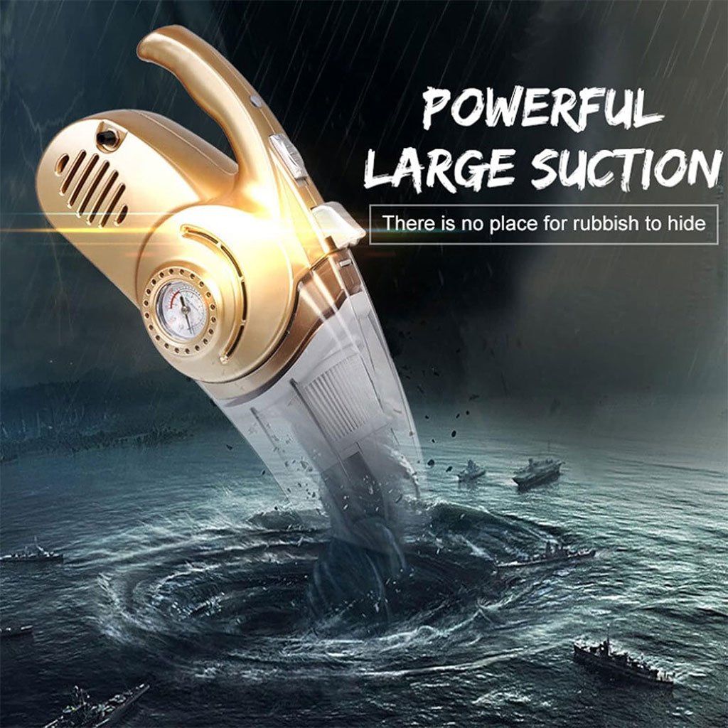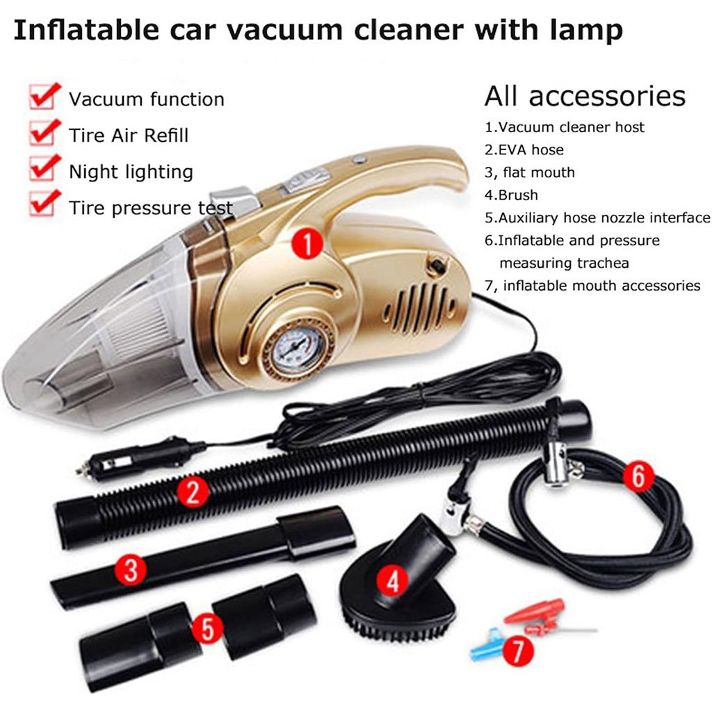 Polyvalence et forte aspiration : aspirateur de voiture 12 V 100 W, aspiration super puissante, supporte une utilisation sèche et humide, peut facilement ramasser la poussière, les miettes, les poils d’animaux, les liquides et bien plus encore. Équipé de 3 types d’accessoires différents pour bien nettoyer toutes les zones de votre maison ou de votre voiture. Design innovant : avec un gonfleur de pneu numérique intelligent, assurez-vous que la pression des pneus est précise et gonflez les pneus à tout moment et n’importe où en 5 minutes. Lumière LED intégrée : l’aspirateur à main dispose d’une lumière LED intégrée, une grande aide pour le nettoyage des endroits sombres et le nettoyage de nuit. Avec cela, vous pouvez nettoyer les endroits difficiles à atteindre sans problème. Fonctionnement plus silencieux : produit moins de 80 dB de son tout en conservant sa puissante capacité d’aspiration basée sur les principes d’amortissement mécanique, ce qui vous donne une expérience de nettoyage confortable, sans déranger vos enfants et effrayer vos animaux de compagnie.