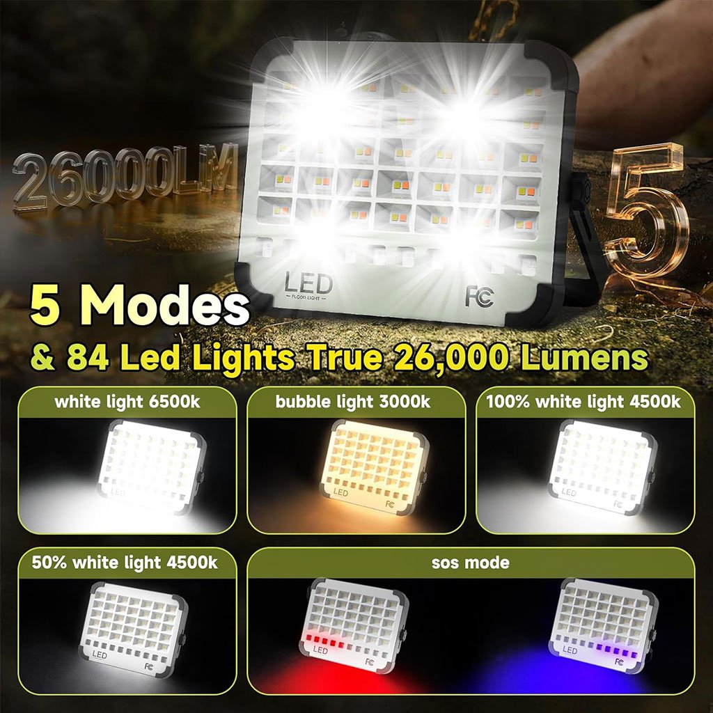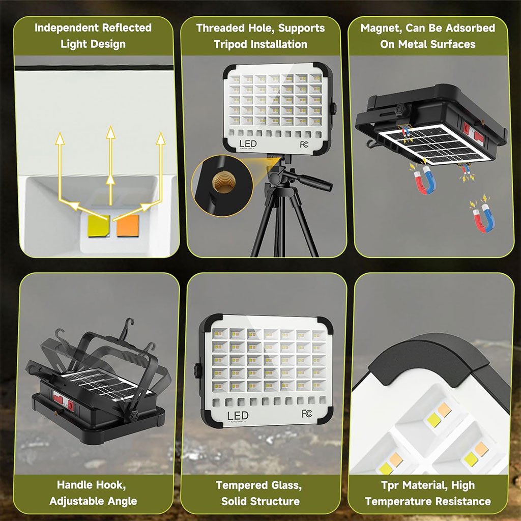 Durabilité et double charge solaire : Conçue comme une lampe solaire portable polyvalente, cette station de travail est équipée d’une batterie puissante de 26 000 mAh et d’une double charge (charge rapide USB en 6 à 8 heures ou recharge solaire en 48 heures au soleil). Idéale pour les aventures hors réseau, elle offre plus de 26 heures d’autonomie à 50 % de luminosité et 15 heures à pleine puissance. De plus, cette lampe de travail d’urgence peut également servir de source d’alimentation de secours pour recharger d’autres appareils électroniques. Projecteur LED rechargeable ultra-lumineux : Équipé de 84 LED améliorées, ce projecteur LED rechargeable délivre 26 000 lumens en cinq modes : blanc, ampoule, luminosité 100 %/50 % et SOS. L’affichage intelligent de la charge de la batterie (25 %-100 %) assure un éclairage fiable sur les chantiers ou en cas d’urgence. Compagnon de camping multi-scénarios : Conçue comme une lampe de camping rechargeable essentielle, elle comprend un support réglable à 180°, des crochets intégrés et des aimants robustes. Accrochez-la à une tente, fixez-la à une surface métallique ou utilisez-la comme lampe autonome pour les barbecues, la pêche ou les réparations en bord de route. Lampe de travail rechargeable robuste : Fabriquée en ABS de qualité industrielle et étanche IP66, cette lampe de travail LED rechargeable résiste aux chutes, à la pluie et aux températures extrêmes. Son port de charge étanche et son boîtier résistant aux chocs la rendent idéale pour les ateliers, les garages et les projets extérieurs. Solutions polyvalentes d’éclairage de travail à LED : Des pannes de courant aux réparations automobiles, cette lampe de travail rechargeable s’adapte à tous les scénarios. Utilisez-la comme projecteur de secours, lampe magnétique pour surfaces métalliques ou balise portable pour le camping et la randonnée, garantissant ainsi votre sécurité dans tous les environnements. Dimensions du produit 230 x 60 x 180 mm Poids de l’article 1KG Type de commutateur Appuyez sur le bouton, touchez Style Compact Marque White Label Couleur Blanc Type de source lumineuse DIRIGÉ Matériel Acrylonitrile butadiène styrène Alimentation électrique Fonctionne sur batterie Nombre de sources lumineuses 84 Composants inclus Manuel d’utilisation, câble USB, lampe de travail à LED Pouvoir 300 watts Nombre d’articles 1 Utilisation intérieure et extérieure Extérieur Tension 3,7 volts Taille 300 W