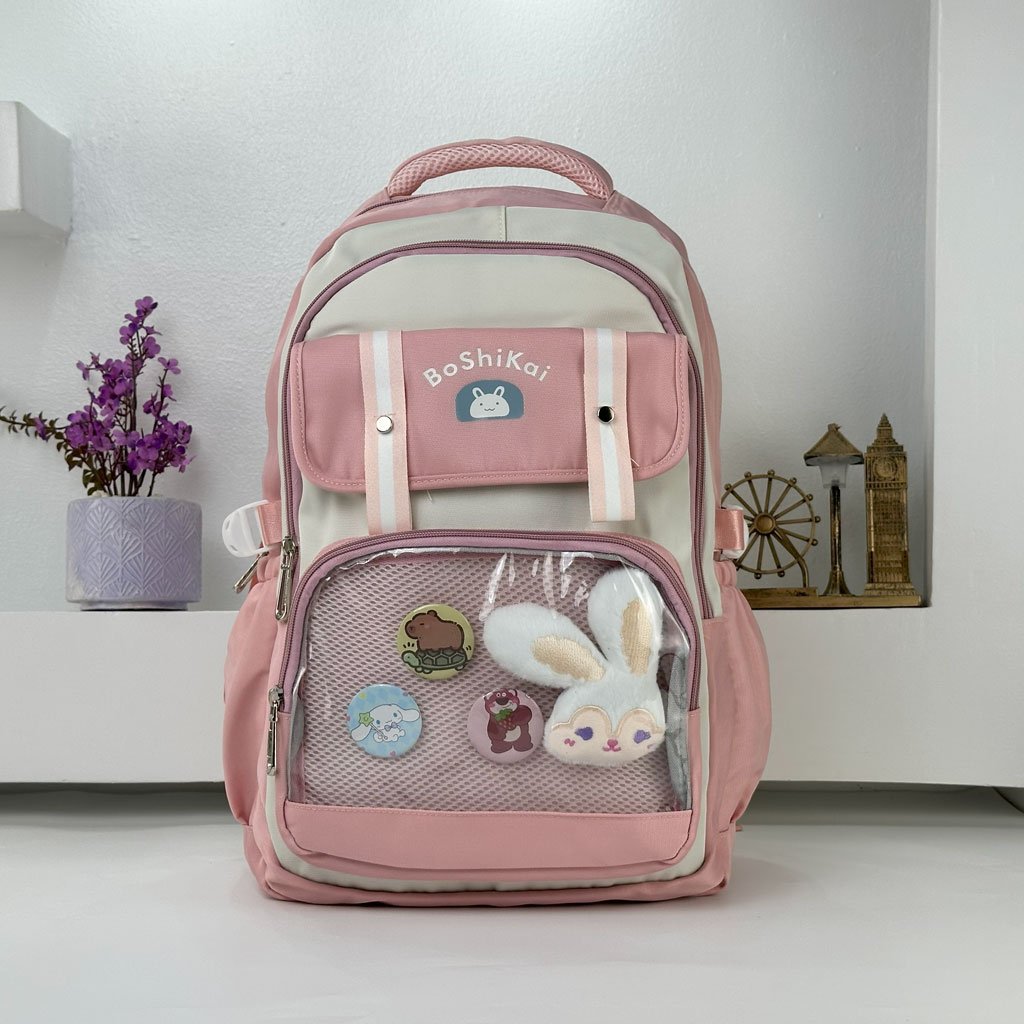 Ajoutez une touche de fantaisie au quotidien scolaire de votre enfant avec ce sac à dos au design kawaii signé BoShiKai . Pratique, original et personnalisable, il plaira autant aux petites qu’aux adolescentes ! Design Kawaii Personnalisable – Une grande poche transparente pour y glisser peluches, autocollants, badges ou petits objets décoratifs. Confort Quotidien – Bretelles larges et ajustables, dossier matelassé pour un port confortable. Poches Multiples – Plusieurs compartiments pour cahiers, trousses, tablette, gourde, etc. Motif Lapin & Logo Mignon – Un style tendance avec son petit lapin blanc et son look coréen. Idéal pour École ou Sorties – Léger, résistant et stylé. Caractéristiques : Dimensions : 45 x 35 x 25 cm Couleur : Rose Poche frontale transparente avec badges et peluche inclus Public : Enfants (primaire, collège ou fans de kawaii) Fermetures éclairs solides, tissu imperméable et durable