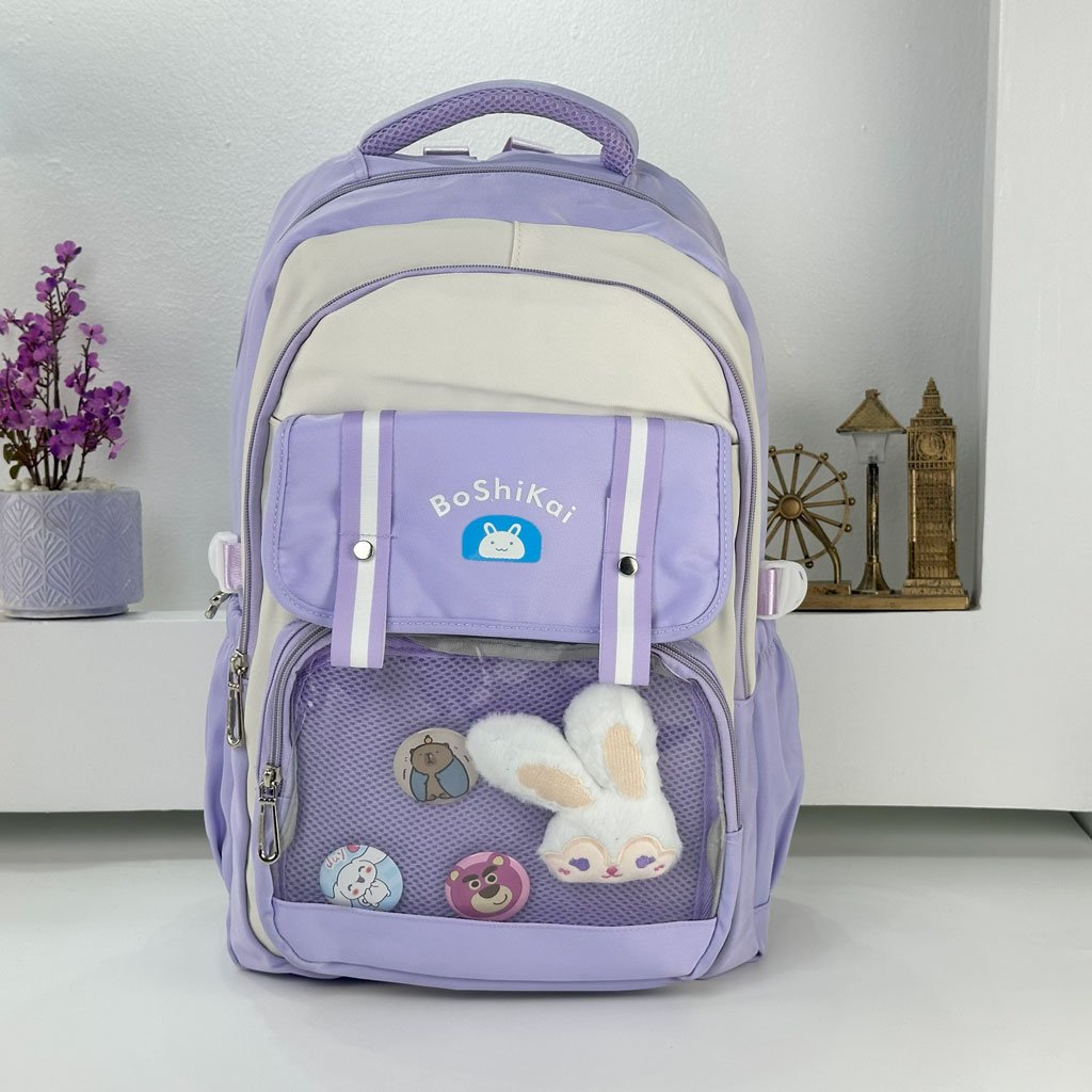 Ajoutez une touche de fantaisie au quotidien scolaire de votre enfant avec ce sac à dos au design kawaii signé BoShiKai . Pratique, original et personnalisable, il plaira autant aux petites qu’aux adolescentes ! Design Kawaii Personnalisable – Une grande poche transparente pour y glisser peluches, autocollants, badges ou petits objets décoratifs. Confort Quotidien – Bretelles larges et ajustables, dossier matelassé pour un port confortable. Poches Multiples – Plusieurs compartiments pour cahiers, trousses, tablette, gourde, etc. Motif Lapin & Logo Mignon – Un style tendance avec son petit lapin blanc et son look coréen. Idéal pour École ou Sorties – Léger, résistant et stylé. Caractéristiques : Dimensions : 45 x 35 x 25 cm Couleur : Mauve Poche frontale transparente avec badges et peluche inclus Public : Enfants (primaire, collège ou fans de kawaii) Fermetures éclairs solides, tissu imperméable et durable