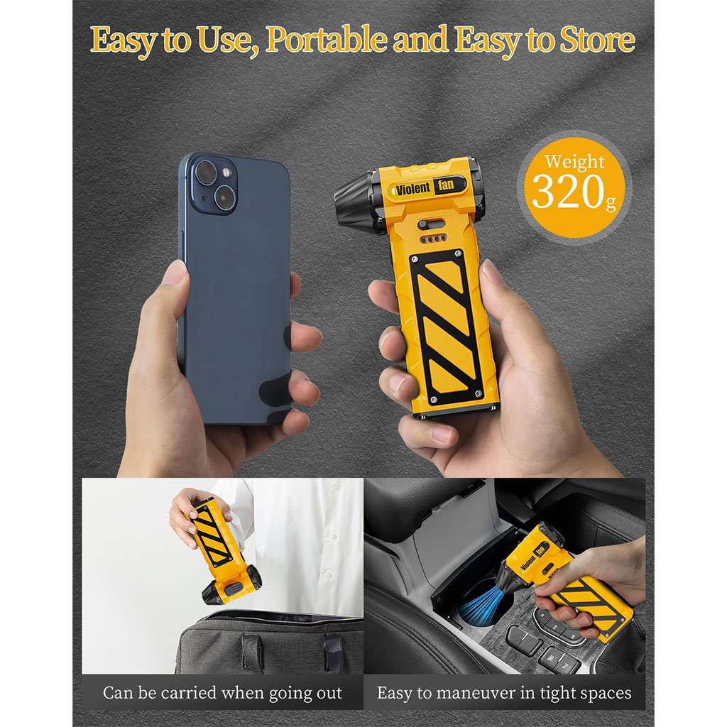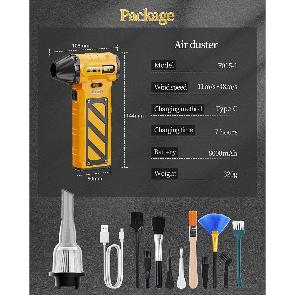 [Puissance de soufflage ultra-puissante de 130 000 tr/min] Voici le dernier dépoussiéreur électrique F015 de 2024. Fabriqué en alliage, le F015 est durable et offre une durée de vie supérieure à celle des produits commerciaux classiques. Sa vitesse de soufflage ultra-élevée de 130 000 tr/min facilite le soufflage de la poussière, doublant ainsi votre efficacité au travail. Il dispose également d’une fonction d’aspiration, ce qui le rend utilisable en toutes circonstances. [Vitesse variable en continu] Faites simplement glisser le bouton vers la gauche ou la droite pour régler facilement le débit d’air, de 60 000 tr/min à 130 000 tr/min. Plus besoin d’appuyer sur le bouton, ce qui vous fait gagner du temps et de l’énergie. Ajustez le débit d’air selon vos besoins. [Batterie rechargeable TYPE-C et grande capacité] Rechargeable TYPE-C pour plus de commodité. Dotée d’une batterie grande capacité de 8000 mAh, elle se recharge complètement en environ 3 heures et offre une autonomie de 20 à 100 minutes. Un voyant lumineux indique l’autonomie restante sous le bouton d’alimentation, vous permettant ainsi de savoir rapidement quand la batterie est faible. [Protection et intervention d’urgence] Équipé d’un marteau de sécurité robuste et d’un coupe-ceinture tranchant, il vous permet de briser le verre et de couper instantanément la ceinture de sécurité en cas d’urgence. Il peut non seulement être utilisé comme dépoussiéreur électrique, mais aussi pour les sorties de secours ; il est donc recommandé pour une utilisation en extérieur. [Multifonction et compact] Ce dépoussiéreur électrique est idéal pour nettoyer les ordinateurs et les voitures. Avec un poids de 320 g et une conception sans fil, il est facile à transporter et peut être utilisé librement à l’extérieur. Il est également adapté aux endroits tels que les interstices des claviers, les climatiseurs, le pollen, l’intérieur des voitures, les stores, les flotteurs gonflables et les éclaboussures d’eau après le lavage. Dimensions : 108x144x50mm.