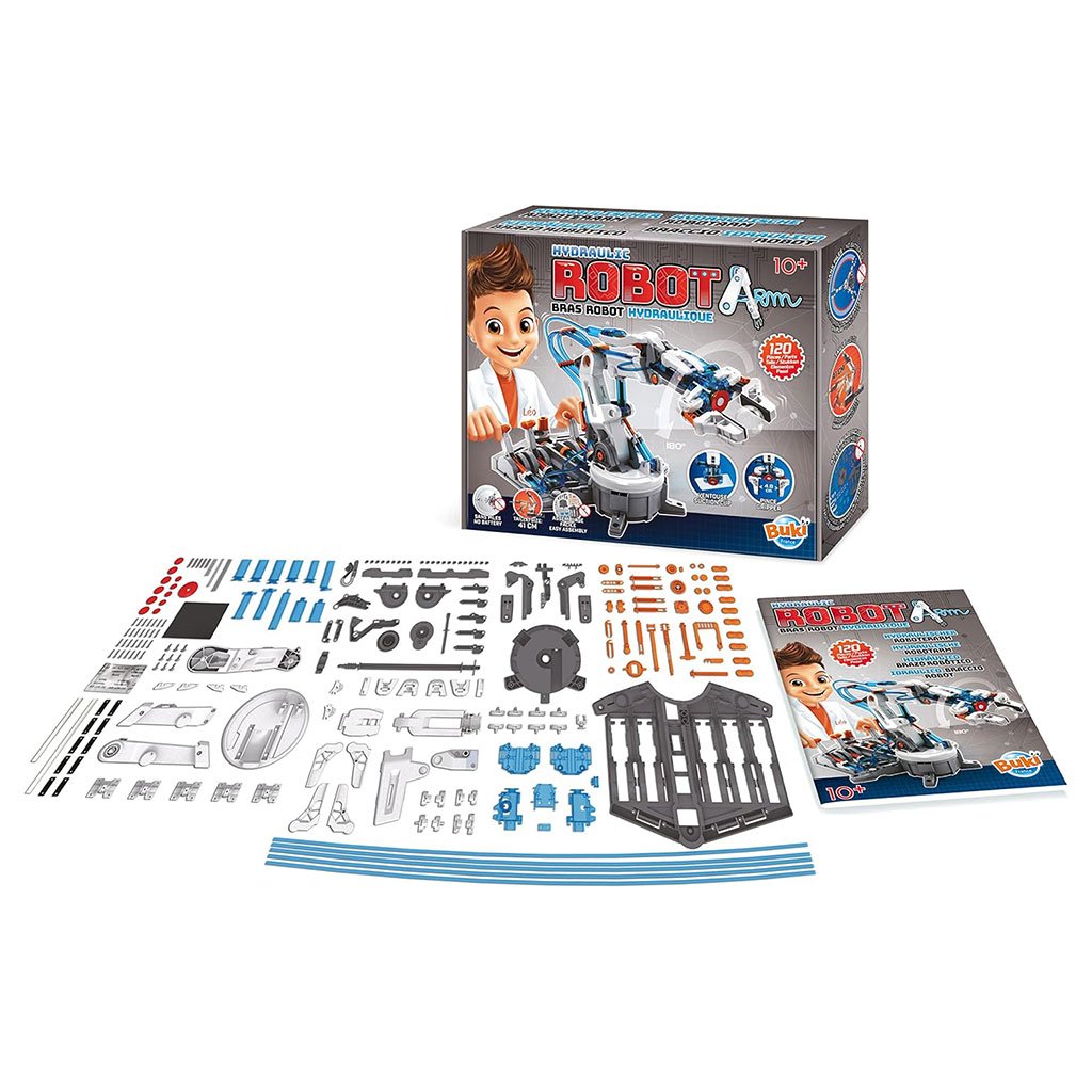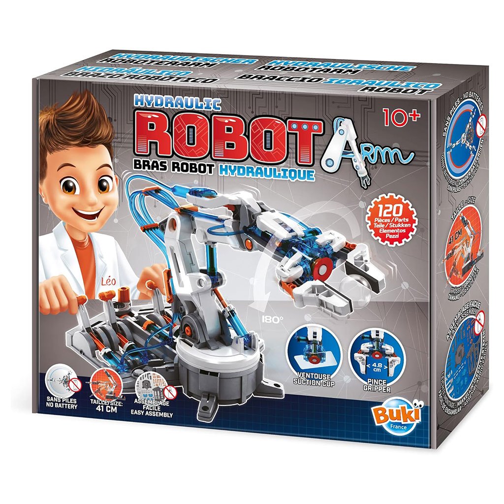 Fabriquer un bras de robot avec articulation en assemblant les pièces individuelles Versez de l’eau dans le système hydraulique et contrôlez-la dans toutes les directions grâce à ses six leviers Age : 10 ans et plus Instructions de montage illustrées en couleur et idées de jeux Dimensions du produit 39,8 x 10,5 x 32,2 cm; 1,27 kg Âge recommandé par le fabricant 10 – 18 ans Numéro de modèle de l’article 7505 Objectif(s) pédagogique(s) Ingénierie, compétences mécaniques Langue: Anglais, italien, français, allemand, espagnol, néerlandais Nombre de joueurs 1
