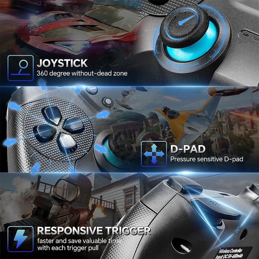 • Contrôleur sans fil Bluetooth : Jouez à vos jeux préférés sans les tracas des fils. Le contrôleur sans fil Bluetooth de soutien TECTINTER vous permet de jouer confortablement à distance. • Compatible avec Nintendo Switch / Switch Oled Android Gamepad USB PC contrôle Joystick : Cette manette de jeu est compatible avec plusieurs appareils, y compris la Nintendo Switch, Switch Oled, Android et PC, ce qui en fait une option polyvalente pour les joueurs. • Type de bouton de déclenchement non linéaire : Le type de bouton de déclenchement non linéaire offre une expérience de jeu plus réactive et précise, vous permettant de contrôler votre personnage avec facilité. • Effet Hall: non : Le contrôleur sans fil Bluetooth de soutien TECTINTER n’a pas d’effet hall, ce qui le rend plus durable et durable. • Compatibilité : Android , TV Box , Steam , Windows , PS3 Connexion multiple 1. Prend en charge le câble de données USB pour connecter l’hôte Switch en tant que poignée filaire, débranchez le câble de données, Bluetooth automatiquement pour se connecter. 2. prise en charge de la connexion sans fil Bluetooth avec le téléphone portable du système Android. 3. prise en charge de la connexion sans fil Bluetooth avec ios13 système téléphone portable 4. Support filaire pour le mode PC360 côté ordinateur Windows, pour obtenir la fonction PC XINPUT. 5. Support filaire pour le côté ordinateur Windows du mode PC, pour obtenir la fonction DINPUT du PC. Fonctionne avec piles AAA non inclus