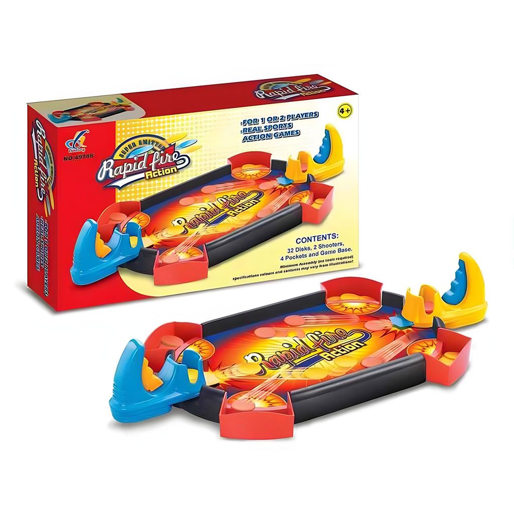 Lancez les disques et visez-les précisément pour les insérer dans les cases devant votre adversaire, tout en évitant qu’ils soient bloqués. Un duel de vitesse et de réflexions arrive dans un défi où chaque seconde compte et seul le plus rapide remporte la victoire. Gagnez avec stratégie et détermination, contrôlez chaque lancer, anticipez les mouvements de votre adversaire et relevez rapidement le défi. Facile à apprendre, mais un défi à relever, un jeu dynamique et addictif qui garantit du plaisir pour tous les âges. Dimensions : 48x24x9cm
