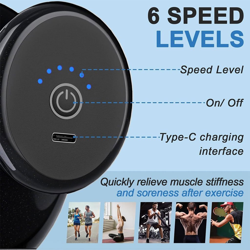 • 🔄 قوة متعددة : مجهز بـ 4 رؤوس و6 سرعات (1200 – 2500 دورة/دقيقة) لتدليك كل مجموعات العضلات.