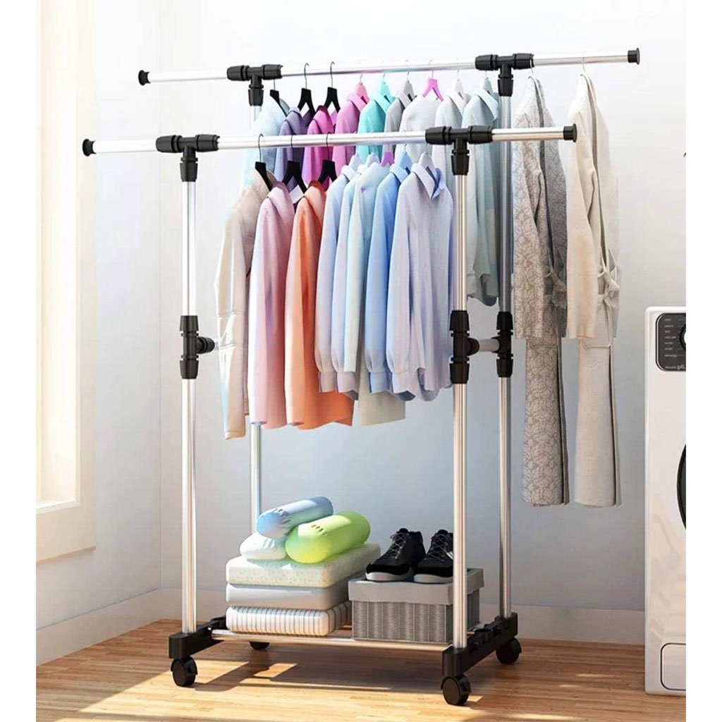 رف ملابس مزدوج محمول بعجلات من الفولاذ المقاوم للصدأ