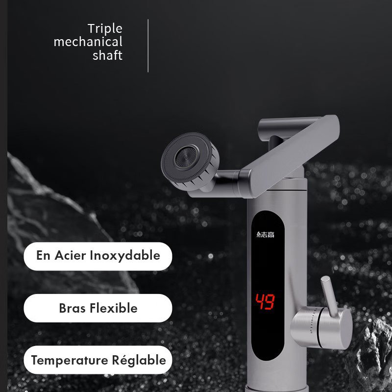 Profitez d’un confort thermique immédiat avec ce robinet électrique intelligent , conçu pour fournir de l’eau chaude en quelques secondes. Son affichage digital LED vous permet de visualiser la température en temps réel, pour un usage sécurisé et précis au quotidien. Doté d’un système de chauffe rapide , il est idéal pour les lavabos de salle de bain ou les éviers de cuisine. Son design moderne en métal mat , son bec orientable et sa commande latérale ergonomique assurent une utilisation fluide et élégante. Parfait pour les foyers recherchant efficacité, sécurité et style. ✅ Caractéristiques principales : Affichage digital LED : température visible en direct Chauffage instantané : eau chaude en quelques secondes Design élégant : finition métallique, forme cylindrique moderne Bec orientable : flexibilité d’usage Commande latérale : réglage facile du débit et de la chaleur Sécurité thermique : contrôle précis pour éviter les brûlures Installation facile : compatible avec la plupart des éviers Économie d’énergie : chauffe uniquement à la demande