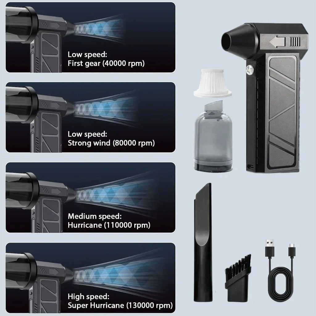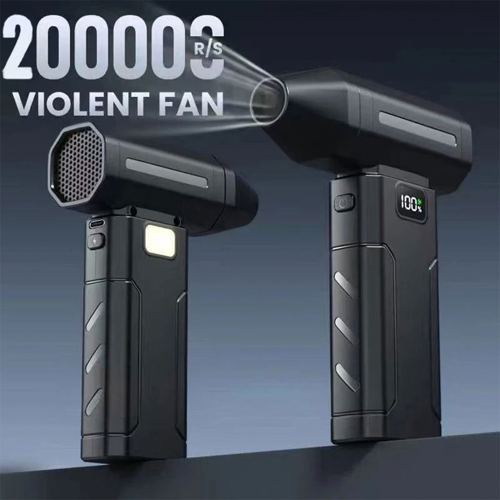 Caractéristiques : 1. Vent ultra-puissant : le moteur sans balais interne atteint des vitesses élevées, jusqu’à 130 000 tr/min. 2. 4 vitesses : première vitesse lente (40 000 tr/min), deuxième vitesse moyenne (80 000 tr/min), troisième vitesse ouragan (110 000 tr/min), quatrième vitesse super ouragan (130 000 tr/min). 3. Design lumineux : ce produit est équipé d’ampoules visibles même dans l’obscurité, ce qui permet de nettoyer la poussière dans les coins et de ne plus avoir peur de la nuit en camping. 4. Portable et compact : grâce à sa petite taille et sa conception légère, il est très pratique à transporter. Le boîtier compact du ventilateur turbo le rend facile à transporter et à utiliser en extérieur. 5. Position de la vitesse, affichage numérique du niveau de batterie : le niveau de batterie est visible en un coup d’œil. Ce sèche-cheveux puissant est équipé de 2 batteries intégrées, permettant un fonctionnement sans fil, sans alimentation externe. Profitez du confort d’une utilisation longue durée. 6. Structure de haute qualité : Design de poche sans fil, élégant et raffiné. L’interface de charge TYPE-C prend en charge la charge rapide, avec un format compact et une utilisation plus facile qu’avec une seule main, garantissant une charge rapide et efficace. 7. Simplicité d’utilisation : Réglage à 4 vitesses avec indicateur lumineux. La conception ergonomique des ventilateurs turbo portables garantit une utilisation aisée. De plus, la carte de charge dispose de fonctions de protection sûres et fiables contre la charge et la surchauffe.