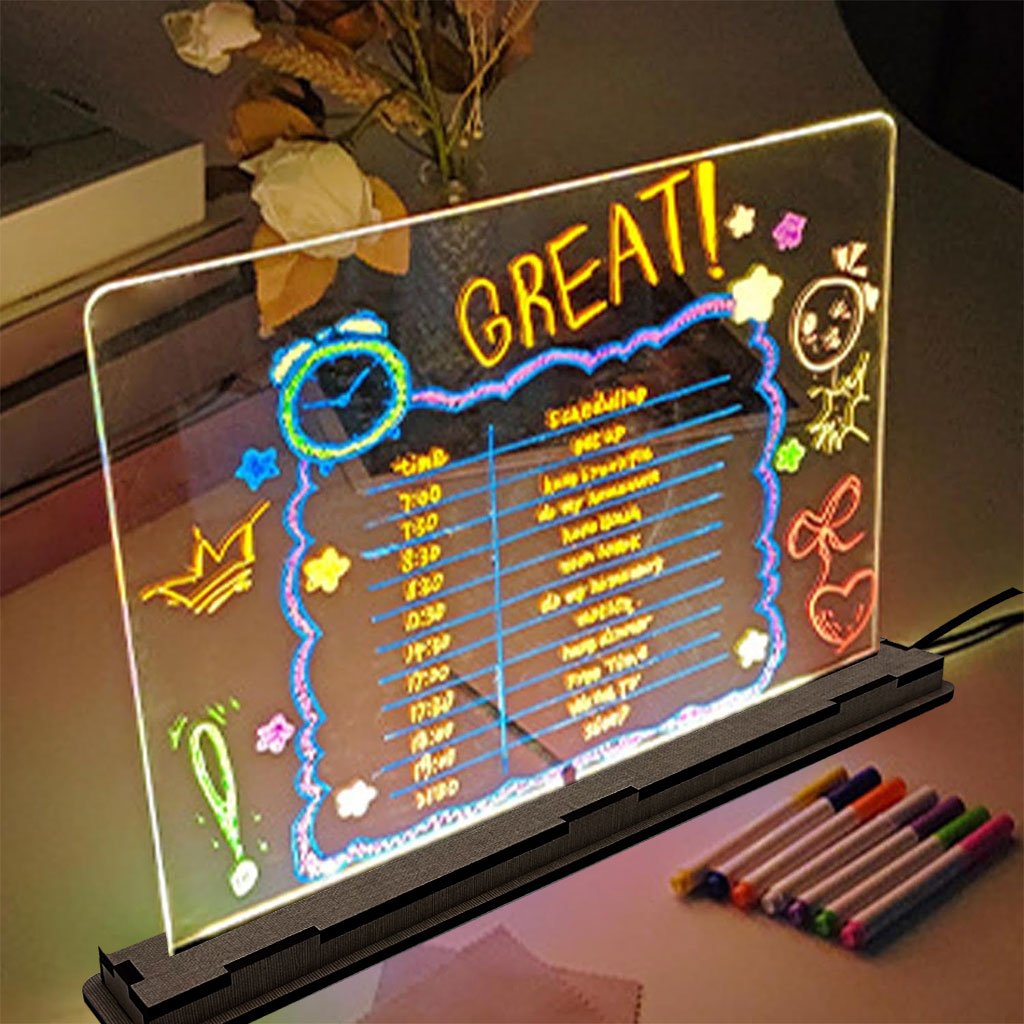 Couleurs vives : le tableau d’affichage LED dispose d’une variété de couleurs vives, ce qui le rend parfait pour créer des messages et des dessins accrocheurs qui se démarquent dans n’importe quel environnement. Utilisation polyvalente : conçu pour de multiples applications, ce tableau d’affichage en acrylique est adapté pour les dessins d’enfants, les rappels ou les affichages créatifs, améliorant à la fois les paramètres de la maison et du bureau. Support réglable : la planche est livrée avec un support réglable, permettant aux utilisateurs de la positionner à leur angle préféré pour une visibilité optimale, que ce soit sur un bureau ou un mur. Facile à nettoyer : l’effacement à sec permet un nettoyage sans effort, que vous pouvez rapidement mettre à jour vos messages ou œuvres d’art sans aucun tracas ou . Ensemble complet : ce produit comprend sept stylos colorés qui sont parfaits pour écrire ou dessiner, offrant tout ce dont vous avez besoin pour commencer à exprimer votre créativité immédiatement. Caractéristiques : Nom de la pièce : planches à dessin pour enfants. Matériau : Acrylique . Dimensions : 30x20cm Couleur : transparent. Contenu de l’emballage : 1 planche à dessin pour enfants. 1 Base Support 4 Stylo Colorés 1 Gomme