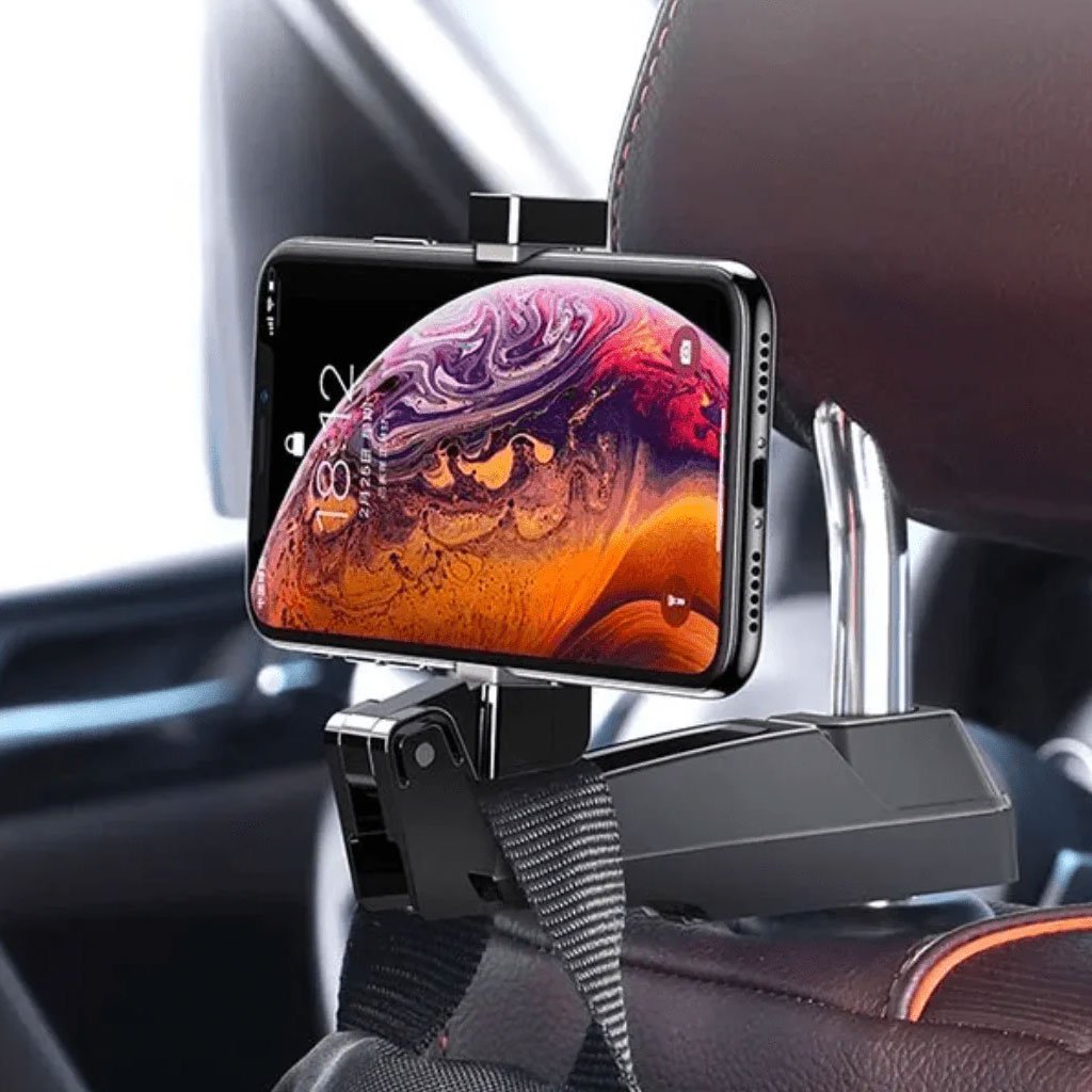 Fixez votre smartphone à l’appuie-tête en toute simplicité grâce au support de téléphone à crochet . Son système de fixation sécurisé vous permet de le fixer et de le verrouiller facilement sur le levier de l’appuie-tête, et c’est parti. Le gel silicone sur les points d’accroche protège le levier de l’appuie-tête et votre téléphone des rayures. Le support de téléphone pour appuie-tête est compatible avec les téléphones de 64 mm à 90mm. Outre sa fonction de support de téléphone, il peut également servir de crochet et supporter jusqu’à 25 kg. Caractéristiques Support de téléphone multifonctionnel pour appui-tête avec crochet Facile à installer sans avoir besoin de retirer l’appui-tête Le gel de silicone antidérapant protège l’appui-tête et le téléphone des rayures Supporte jusqu’à 25 kg sur le crochet Compatible avec tous les téléphones de 64 à 90mm de largeur S’insère entre les leviers d’appui-tête lorsqu’il n’est pas utilisé pour un look dissimulable