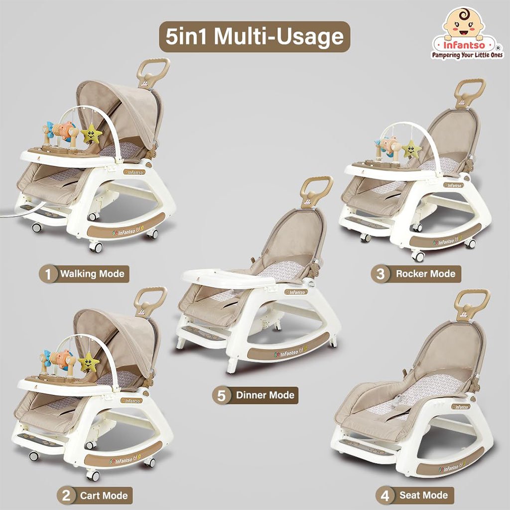 Polyvalence 5 en 1 : cette chaise à bascule et chaise pour bébé comprend cinq modes : bascule, marcheur, siège de salle à manger, chariot et chaise de jeu, ce qui la rend utile à chaque étape. Construction sûre et robuste : Fabriqué à partir de matériaux non toxiques, le fauteuil à bascule et la chaise Baybee assurent à la fois sécurité et confort avec une base stable et un siège moelleux. Idéal pour l’heure du repas : utilisez cette chaise à bascule et chaise pour bébé comme siège de salle à manger avec un plateau sécurisé, permettant à votre tout-petit de profiter de l’heure du repas en toute simplicité. Le basculement devient amusant : le mouvement fluide du rocker apaise votre enfant, tandis que la conception ludique le maintient occupé. Grandit avec bébé : ce fauteuil à bascule et chaise convertible pour bébé s’adapte à ses besoins, prenant en charge des activités allant de la détente au jeu Stimulation sensorielle : Conçu pour favoriser le développement, ce fauteuil à bascule et chaise pour bébés encourage le jeu sensoriel avec des jouets suspendus attachés. Facile à déplacer et à ranger : léger et compact, ce fauteuil à bascule et chaise pour bébé est parfait pour voyager ou se déplacer dans la maison. Nettoyage rapide : avec des surfaces lavables et des pièces amovibles, le fauteuil à bascule et la chaise pour bébé sont faciles à entretenir pour les parents occupés. Dimensions sur les photos