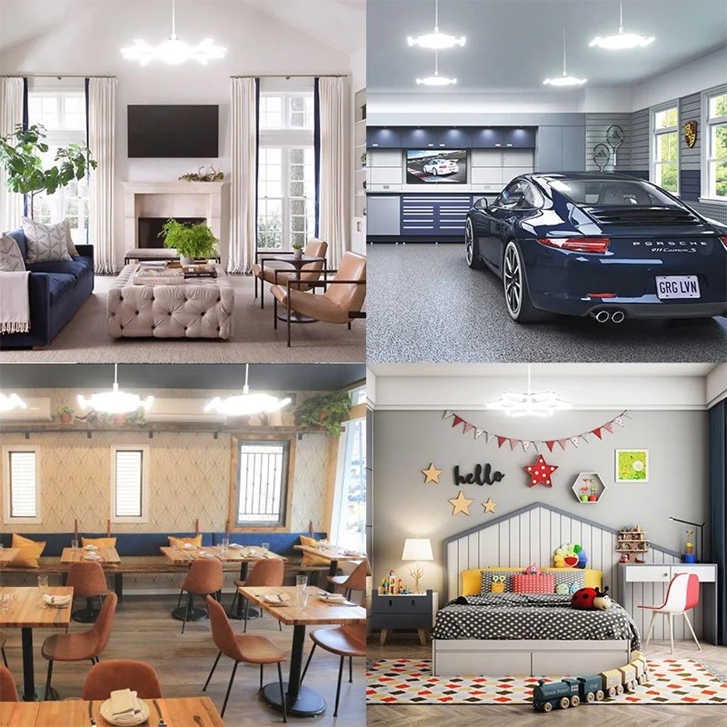 ÉCLAIRAGE ULTRA-PUISSANT 6500K ET UTILISATION POLYVALENTE : Illuminez n’importe quel espace avec une lumière du jour naturelle et puissante de 6500K. Idéal pour les garages, ateliers, sous-sols, greniers, entrepôts, buanderies, placards ou tout autre espace intérieur nécessitant un éclairage clair et performant qui réduit la fatigue oculaire. ÉCLAIRAGE PERSONNALISÉ À 5 PANNEAUX DÉFORMABLES : Ce luminaire est doté de cinq panneaux LED blancs orientables jusqu’à 90 degrés. Créez la forme et la diffusion de faisceau idéales pour concentrer la lumière précisément là où vous en avez besoin : parfait pour les coins, les établis ou pour obtenir une couverture à 360 degrés dans des espaces atypiques. MISE À NIVEAU INSTANTANÉE – VISSER ET ILLUMINER : Remplacez vos ampoules existantes en toute simplicité ! Le culot standard E26/E27 permet une installation facile par vissage dans n’importe quelle douille compatible. Profitez d’un éclairage puissant et instantané, sans câblage complexe ni outils : une véritable solution d’éclairage prête à l’emploi. ÉCONOMIES D’ÉNERGIE ET D’ARGENT : Profitez d’une lumière ultra-brillante tout en réduisant considérablement votre facture d’électricité. Consomme jusqu’à 85 % d’énergie en moins que les ampoules incandescentes ou fluorescentes traditionnelles, offrant une luminosité exceptionnelle et des économies substantielles à long terme. CONSTRUCTION ROBUSTE ET LONGUE DURÉE DE VIE : Conçue pour durer grâce à des matériaux haut de gamme assurant une dissipation thermique optimale, cette construction robuste, résistante aux hautes températures et à la corrosion, garantit des performances fiables et une durée de vie prolongée jusqu’à 50 000 heures, pour une tranquillité d’esprit totale.