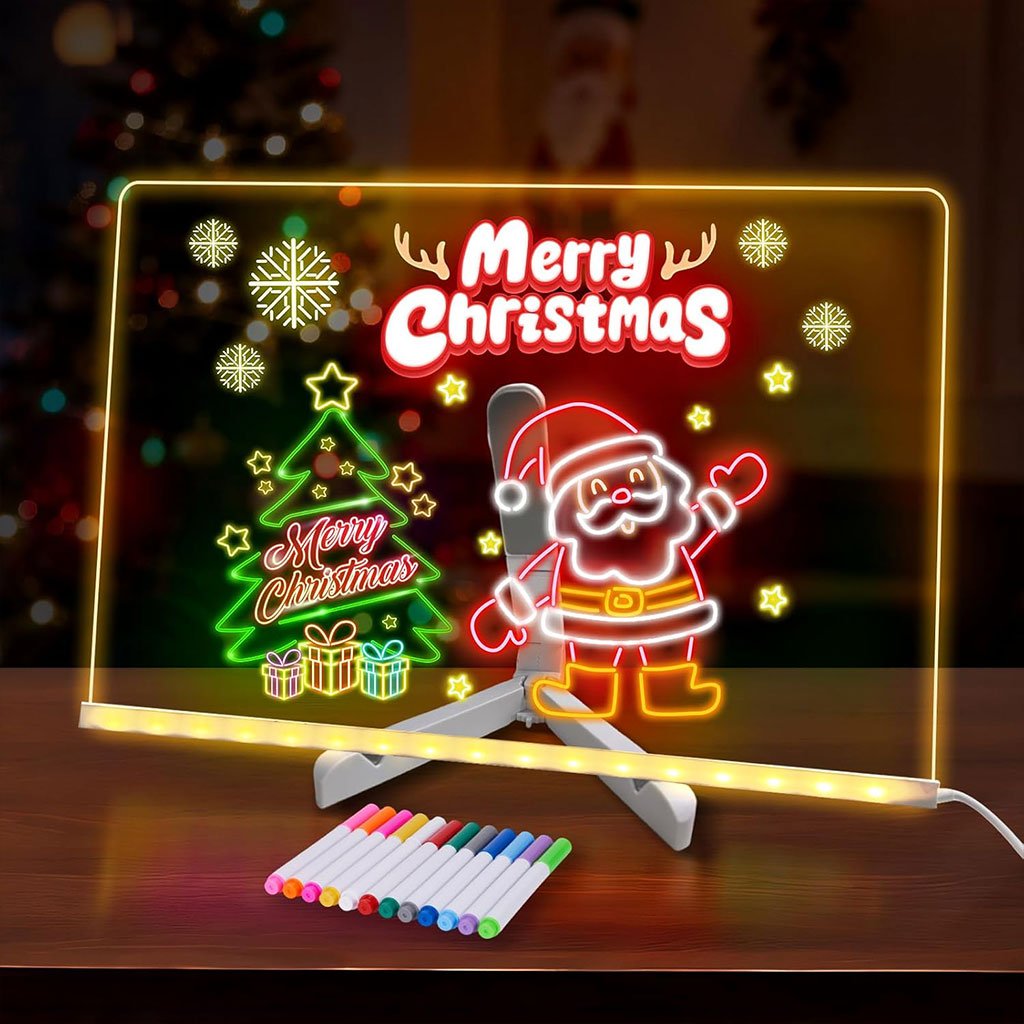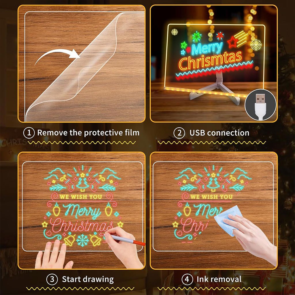 Tableau mémo lumineux à LED : contrairement aux tableaux noirs classiques, ce tableau lumineux peut inciter les enfants à se concentrer sur ce qui y est écrit. Il peut servir de tableau à dessin, de tableau de planification ou même de bloc-notes lumineux. Il vous permet d’écrire de doux messages à vos enfants ou à vos proches. Tableau blanc LED réutilisable avec 7 stylos de couleurs : Ce tableau comprend 7 stylos de couleurs différentes et 2 chiffons. Écrivez et dessinez facilement et avec fluidité sur le tableau. L’encre sèche rapidement et s’efface facilement. Si l’écriture est trop sèche, utilisez un chiffon en coton humide pour l’effacer délicatement. Design lumineux : Ce tableau d’affichage innovant en acrylique à LED offre un effet lumineux captivant. Tableau effaçable à sec en acrylique à LED. Fabriqué en acrylique transparent avec une surface non marquante, il présente un design léger, élégant et épuré. Idéal pour le bureau, la maison ou tout autre environnement. Multifonctionnel : le tableau d’affichage LED en acrylique peut servir à de multiples usages. Que ce soit comme tableau de menu de café, tableau des tâches ménagères, tableau de visualisation inspirant, tableau à croquis, tableau à dessin, bloc-notes ou encore bloc-notes avec calendrier, ce tableau lumineux répondra à tous vos besoins. Note d’utilisation : Bloc-notes LED, veuillez retirer le film protecteur double face de la plaque acrylique avant utilisation. Équipé d’un trépied réglable, placez le tableau blanc effaçable à sec à l’angle approprié.