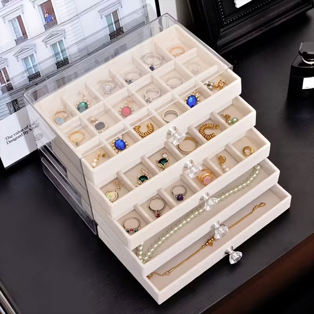 【GRANDE CAPACITÉ À PLUSIEURS NIVEAUX】 : Grande boîte à bijoux à 5 tiroirs compartimentés, idéale pour ranger bagues, boucles d’oreilles, colliers, bracelets, pinces à cheveux, boutons de manchette, broches, montres, lunettes, ornements, etc. 【MATÉRIAUX DE QUALITÉ】 : Cette boîte à bijoux à 5 tiroirs répond à tous vos besoins. Fabriquée en PET et PP de qualité, avec un couvercle transparent et une doublure floquée protectrice, sa surface est à la fois esthétique et délicate, protégeant ainsi vos bijoux. 【DESIGN UNIQUE】 : Cet organiseur de bijoux offre une grande capacité de rangement. Son couvercle transparent permet une visibilité optimale du contenu, et sa construction robuste vous permet de repérer facilement vos bijoux préférés. 【DIMENSIONS IDÉALES】 : Avec ses dimensions idéales (23,5 cm x 13,5 cm x 17 cm), cet organiseur de bijoux est léger et facile à transporter. 【IDÉE CADEAU PARFAITE】 : Cet organiseur de bijoux est un cadeau idéal pour… Cadeau idéal pour une mère, une petite amie, une épouse ou une fille à l’occasion de la Saint-Valentin, de la fête des Mères, de Thanksgiving, d’un anniversaire, d’un anniversaire de mariage ou d’un mariage. Spécification: Matériau : PET, PP Tableau des tailles : 23,5 cm x 13,5 cm x 17 cm / 9,25 pouces x 5,31 pouces x 6,69 pouces Le paquet comprend : 1 boîte à bijoux