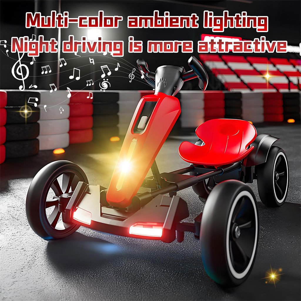 PERFORMANCES RAPIDES ET FIABLES : Doté d’un moteur robuste de 390 W et d’une batterie 12V 4.5 A, ce kart électrique offre des performances fluides et fiables. Son moteur puissant procure des sensations fortes, tandis que sa batterie longue durée garantit des heures de plaisir. Supportant un poids maximal de 40 kg, il convient à un large éventail de jeunes pilotes. VOLANT INTERACTIF : Le volant permet de contrôler la musique, les lumières et le volume, pour des trajets toujours plus amusants et captivants. Les boutons marche avant et marche arrière facilitent la conduite, tandis que les fonctionnalités interactives renforcent le plaisir et la sécurité. Ce kart est idéal pour divertir et faire bouger les enfants. ROBUSTE ET DURABLE : Conçu avec un châssis solide et quatre roues résistantes à l’usure, ce kart est fait pour résister aux jeux les plus intenses et aux terrains les plus accidentés. Sa construction durable garantit une performance durable, ce qui en fait un choix fiable pour les parents et un favori des enfants. Le siège réglable le rend encore plus polyvalent, permettant ainsi aux enfants en pleine croissance de s’y installer confortablement. DES COURSES NOCTURNES AMUSANTES ET SÉCURISÉES : Grâce à ses lumières LED éblouissantes, ce mini kart pour enfants garantit une expérience de conduite amusante et sécurisée, même la nuit. Les lumières éclatantes rendent chaque balade plus excitante et plairont sans aucun doute aux enfants qui aiment se faire remarquer. Faciles à contrôler via le volant, les lumières ajoutent une touche d’interactivité supplémentaire. CONCEPTION PLIABLE POUR UN MONTAGE ET UN TRANSPORT FACILES : Ce kart électrique pour enfants se plie et se déplie sans effort en un seul geste, facilitant ainsi son rangement et son transport. Avec des dimensions compactes une fois plié (84 x 30 x 25 cm), son format peu encombrant est idéal pour les parents, tandis que les enfants profitent d’heures de plaisir. Spécifications : Couleurs : Blanc, Bleu, Jaune, Rouge. Batterie : 12V 4.5 Ah. Moteur : 780 W Dimensions : 84 x 56 x 51 cm. Dimensions plié : 84 x 30 x 25 cm. Poids net : 2,7 kg. Âge recommandé : 3-8 ans. Poids maximal supporté : 40 kg . Temps de charge : 6 à 8 heures. Vitesse : 5 à 6,5 km/h. Hauteur du siège réglable : 5 cm.