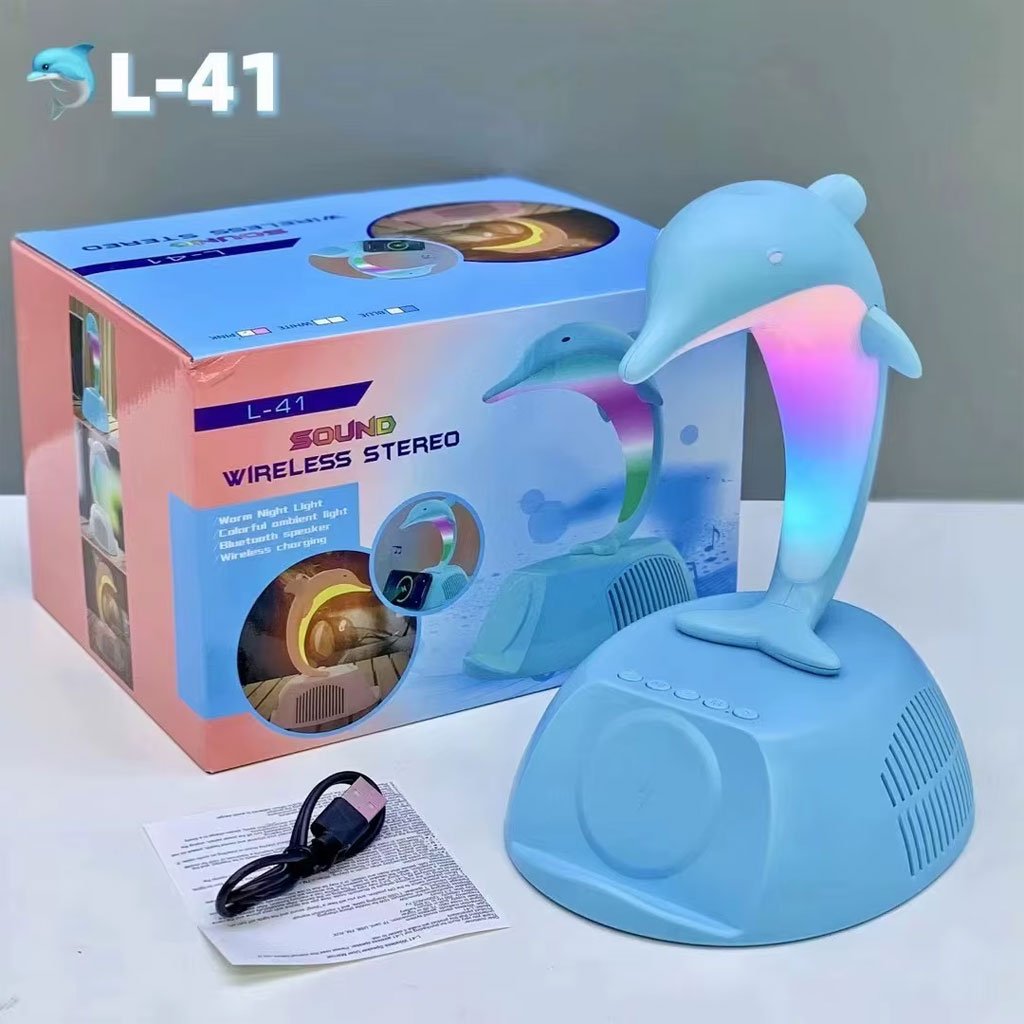 [Design Unique & Élégant] : Avec sa forme de dauphin moderne et épurée, cet appareil n’est pas seulement un gadget technologique, mais un véritable objet de décoration qui apporte une touche de douceur à votre intérieur. [Multifonction 4-en-1] : Profitez d’un combiné performant regroupant un haut-parleur Bluetooth haute fidélité, une lampe d’ambiance colorée, une veilleuse apaisante et une station de charge sans fil rapide. [Chargeur Sans Fil Rapide 15W] : Rechargez votre smartphone en toute simplicité en le posant simplement sur la base de l’appareil. Idéal pour votre table de nuit ou votre bureau (compatible avec les téléphones dotés de la technologie Qi). [Ambiance Lumineuse Personnalisable] : Choisissez parmi 256 modes d’éclairage et des couleurs RGB éclatantes pour créer l’atmosphère parfaite selon votre humeur : lecture, relaxation ou soirée festive. [Connectivité Totale] : Écoutez votre musique préférée via Bluetooth, port USB, carte TF (micro SD) ou entrée AUX. L’appareil dispose également d’une fonction Radio FM intégrée pour ne jamais manquer vos émissions favorites. [Autonomie & Portabilité] : Équipé d’une batterie au lithium rechargeable de 1200 mAh, profitez de 2 à 3 heures de lecture sans fil. Son format compact permet de le déplacer facilement d’une pièce à l’autre. Caractéristique Détails Modèle L-41 Puissance de charge sans fil Jusqu’à 15W Haut-parleur 5W / 45mm Batterie 1200mAh / 3.7V Modes de lumière 256 types d’effets LED Connectiques Bluetooth, Carte TF, USB, FM, AUX Dimensions 170mm x 140mm x 209mm Contenu du pack 1x Enceinte, 1x Câble de charge USB, 1x Manuel d’utilisation