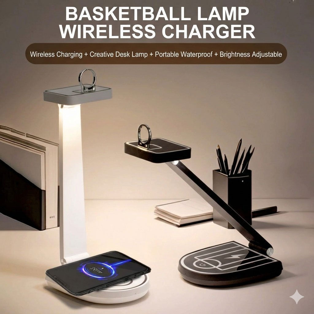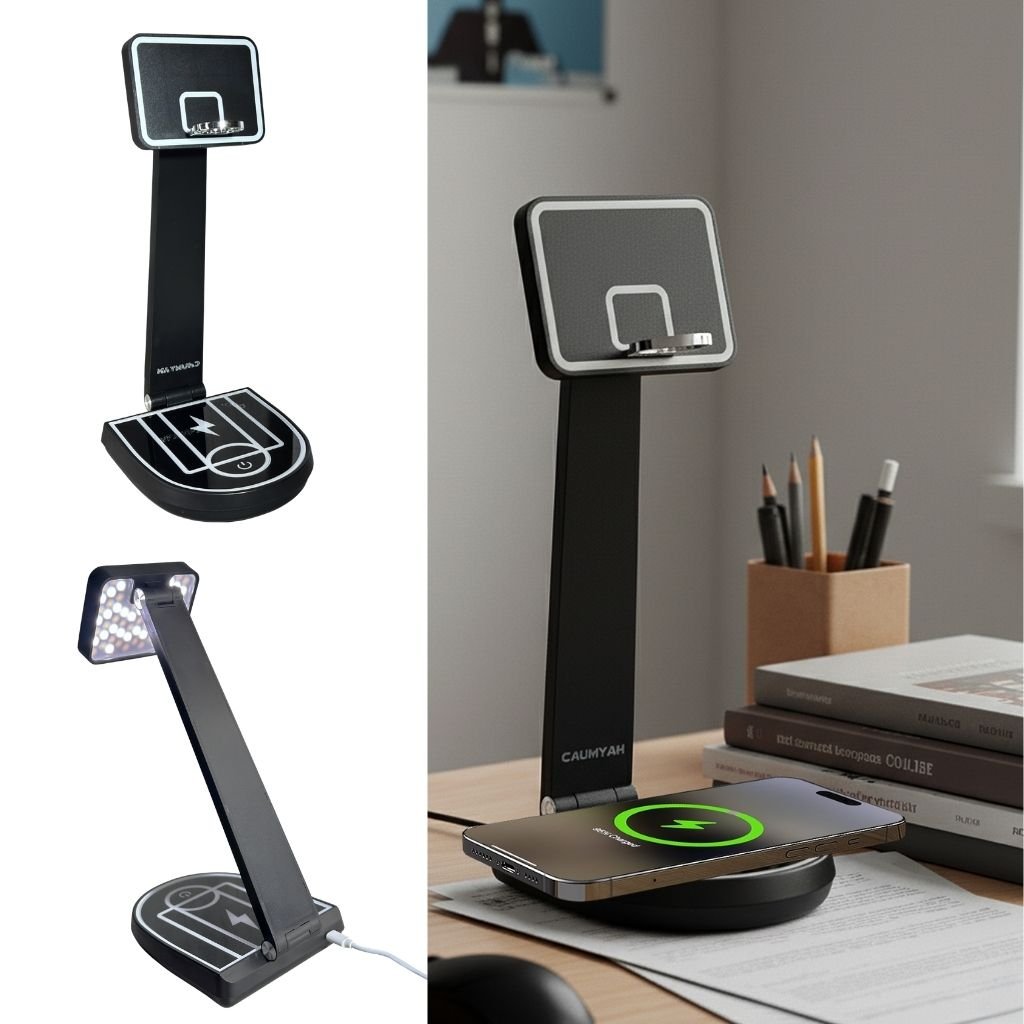Caractéristiques Techniques Charge sans fil : Puissance allant jusqu’à 15 W , permettant de recharger rapidement les smartphones et autres appareils compatibles avec la norme Qi. Éclairage : Puissance : 4 W (idéal pour la lecture ou comme veilleuse). Température de couleur : Environ 3003 K (lumière blanc chaud, apaisante). Contrôle : Commande tactile (Touch control) pour allumer ou éteindre la lampe. Design et Matériaux : Matériau : Plastique ABS de haute qualité. Dimensions : Longueur de 260 mm et largeur de 110 mm. Style : Design moderne et original avec un socle rappelant un ballon de basket. Alimentation : Fonctionne via un port USB Type-C (câble généralement inclus).