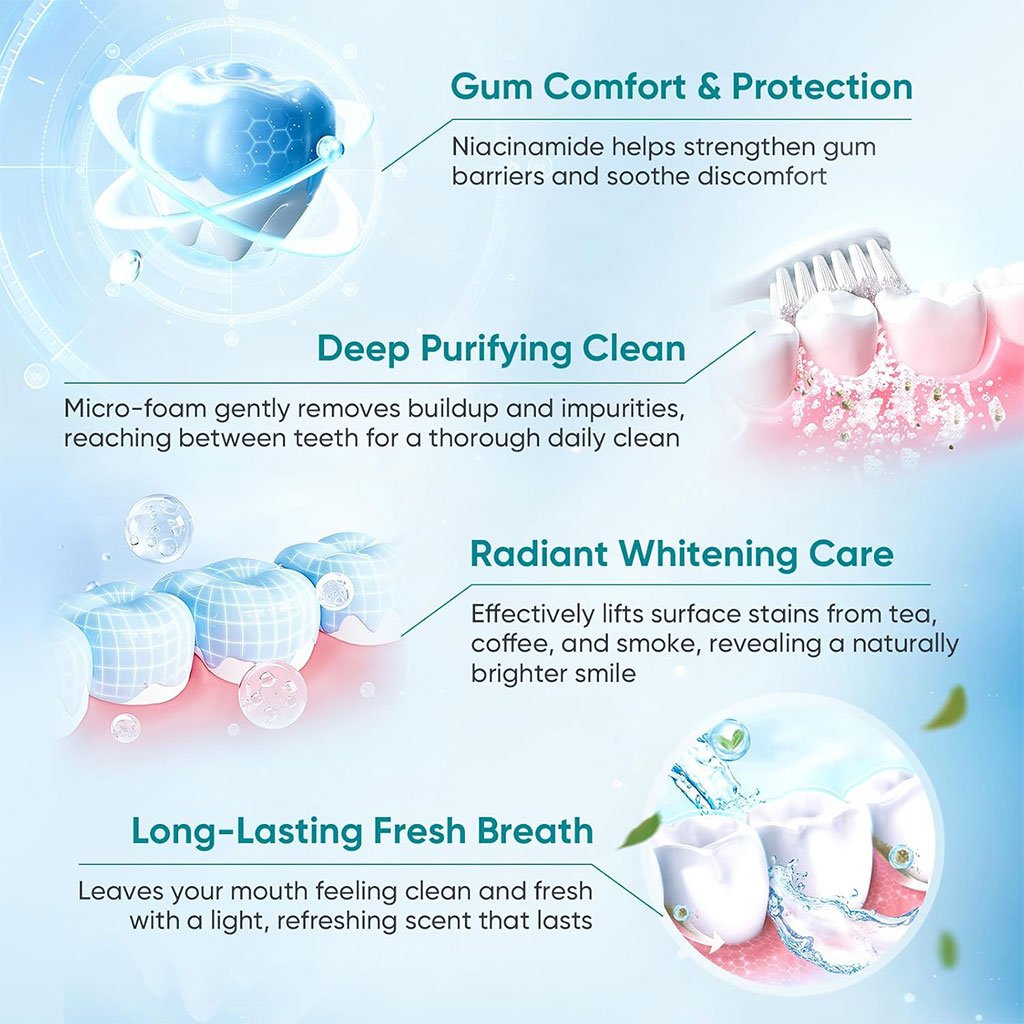Nettoyage en douceur : le dentifrice blanchissant Bodyaccel est formulé avec des particules polissantes et de l’extrait de niacinamide pour un sourire plus éclatant et plus sain au fil du temps. Le blanchiment est progressif et peut varier selon les habitudes bucco-dentaires et la fréquence d’utilisation. Haleine fraîche toute la journée : Enrichi en extraits naturels de menthe, le dentifrice Bodyaccel aide à réduire les odeurs buccales et laisse une sensation de bouche propre et fraîche tout au long de la journée, ce qui le rend idéal pour l’hygiène bucco-dentaire quotidienne. Soin naturel et doux : élaboré à partir d’ingrédients naturels soigneusement sélectionnés comme le xylitol, l’extrait de Chondrus Crispus et la silice hydratée, le dentifrice Bodyaccel prend soin de vos dents et de vos gencives en douceur, favorisant ainsi une bonne santé bucco-dentaire. Formule sans fluor : Ce dentifrice sans fluor assure une réparation intensive de l’émail et une protection contre les caries, ce qui le rend adapté à tous les âges, y compris aux personnes sensibles au fluor. Soin complet des gencives : Grâce à ses nutriments bénéfiques pour les gencives, le dentifrice Bodyaccel soulage la sensibilité dentaire, fortifie les gencives fragiles et prévient les saignements. Son parfum de pêche et de fleur de cerisier laisse une agréable sensation de fraîcheur en bouche. Poids Net : 100g
